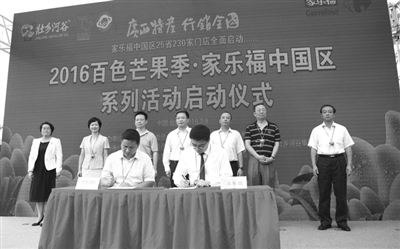 图为广西壮乡河谷集团与家乐福超市签约,双方达成意向订单。