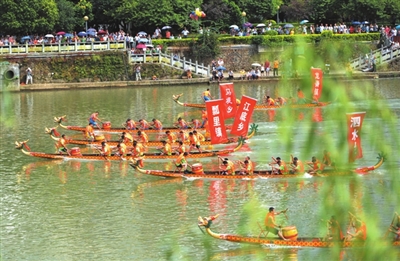 龙舟赛。桑江上的龙舟赛激动人心。踩着密集、快节奏的划龙舟鼓点,参赛队员们奋臂划桨,一艘艘龙舟劈波斩浪,震耳欲聋的锣鼓声、号子声、呐喊声此起彼伏,场面十分壮观。而江上的独竹漂表演不但扣人心弦,画面也美得堪称水上芭蕾,岸边群众不时发出阵阵喝彩。