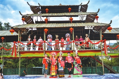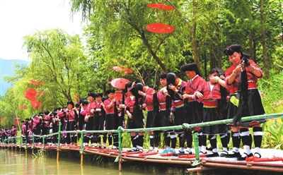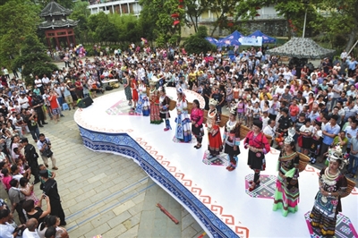 千人长发展示和团圆舞。桑江河上的江心洲,一道道靓丽的“风景”让中外游客惊叹不已——红瑶妇女在歌曲《长发瑶》的优美旋律中绕江心洲进行长发梳妆表演,10条竹排载着60名红瑶少女顺江漂流而下,在江水的映衬下,构成了一幅美丽的画卷;在江心洲的中央,1800余名苗、瑶、侗、壮、汉族同胞在《团圆曲》的旋律中跳起团圆舞,场面蔚为壮观。