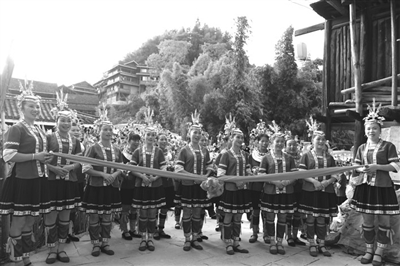 图为侗胞唱着歌拦路迎宾。(龚普康 摄)