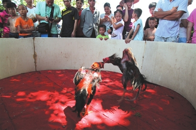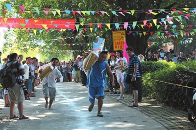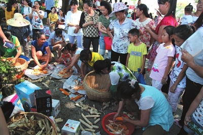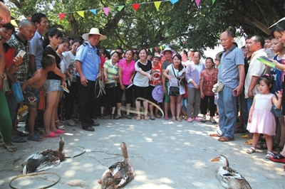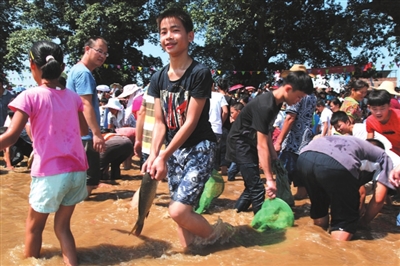 当天,十里八乡的群众都赶来观看“丰收节”,有来自柳州、南宁的游客,更多的是来自周边村屯的群众。在活动现场,每个节目都引人入胜,欢呼声、呐喊声此起彼伏,像过大年一样热闹非凡。瞧,扛肥料比赛中,男队员扛100斤,女队员扛50斤,只见参赛者打着赤脚,随着裁判员吹响的哨声迅速扛起肥料在跑道上飞一样向终点奔跑;斗鸡现场更是里三层外三层围满人,因为两只公鸡斗了1个多小时还没分胜负;抛圈套鸭比赛排的队伍像长龙,400只鸭子等着现场的群众来圈,抛圈者站在2米开外若能将圈准确抛中套在鸭脖子上,就可以把鸭子抱走,这个项目吸引了现场男女老少参加,有的群众百发百中,抛2个圈都套中鸭子,左右双手抱着鸭子脸上乐开了花;最为高潮迭起的是浑水摸鱼,当几百条鱼投放于不到膝盖深的河水中时,男女老少便纷纷奔下水里抢摸起来,不到半个小时,所投放的鱼儿都被捉住了,欢呼声、呐喊声构成了一幅优美的画面。