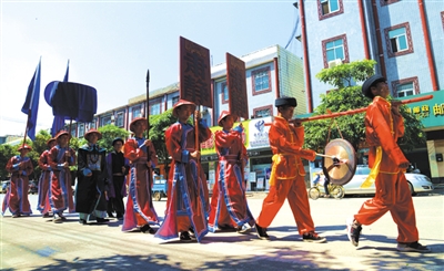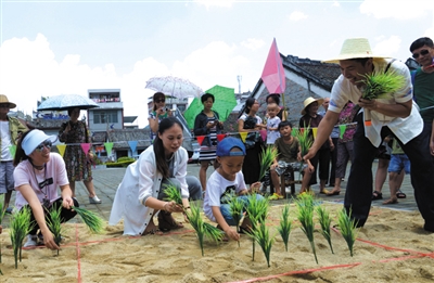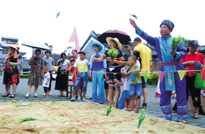 在7月9日忻城县六月六“尝新节”暨土司农耕文化民俗展演活动上,演员们身着古装实景演绎“土司劝农” 巡游场景,使现场游客瞬间穿越回到土司统治年代,独具特色的壮族服饰展演令观众眼前一亮,插秧抛秧互动环节把游客带回古农耕文化时代,让游客们在体验壮族农耕文化中与壮族同胞共庆佳节。