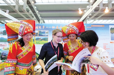 图为8月23日,壮族姑娘在展会上向德国嘉宾Florrnce Nick(左二)介绍柳州市美丽乡村旅游资源。