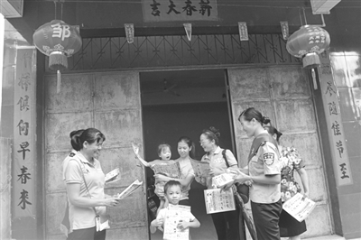 图为8月21日,城北西约社区帮教队队员黄菊莲(左一)、李莉(右三)等给居民发放治安宣传资料。