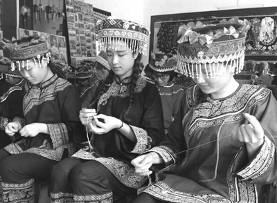 图为在该县四把镇双寨村中寨屯“非遗”传习基地,仫佬族姑娘们正在学习马尾绣制作技艺。