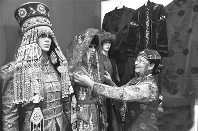 图为来自乌审旗的蒙古族传统服饰内蒙古自治区级代表性传承人仁庆苏布德在布置展厅。