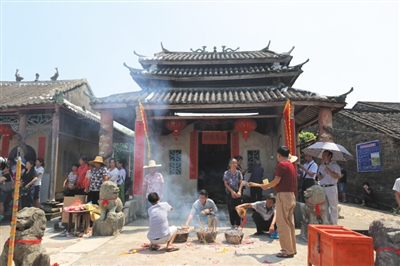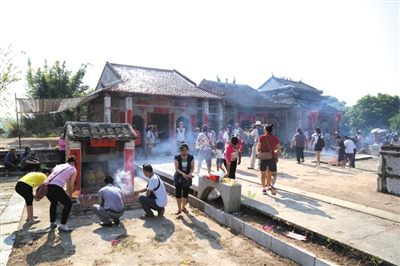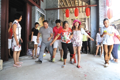 在古镇北端,有粤东会馆遗址和甘王庙。8月30日是甘王庙神灵甘王诞辰日,古镇居民举办隆重的祭祀活动,传承这个已有千年历史的传统民俗节日。当天一大早,运江古镇锣鼓喧天、鞭炮声阵阵,活动序幕拉开了。笔者在古镇看到,停靠在古镇码头河滩上的车辆排成长龙,前来一睹古镇风采的自驾游客络绎不绝。村民在古镇老街高悬百盏宫灯,在街道两旁插满酒旗、茶旗、药旗,再现当年繁华景象,一时间仿佛穿越时空。舞狮队伍用独特方式在古镇街口迎接游客,整个小镇洋溢着喜庆气氛。