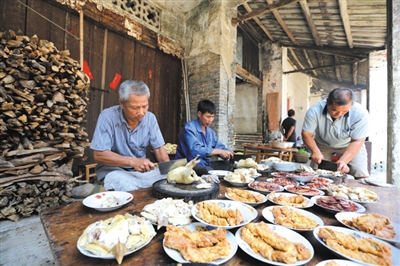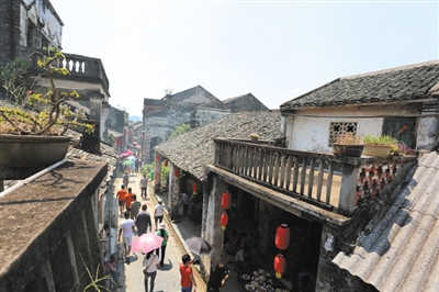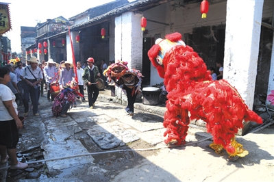 在活动现场,数千名游客随着游街表演的醒狮队伍漫步在千年老街上。喧闹声中,浩浩荡荡的游街队伍穿过大街,一路向东而行,到甘王庙上香祭拜;骑楼下,当地居民刚把做好的芋头糕、汤圆等小吃摆出来,马上被游客抢购一空;居民楼门前挂满五颜六色的灯谜,游客聚在一起,你一言我一语互相竞猜,好不热闹;老街街头,古镇民间大厨精心烹饪百家宴美食,酸辣扣肉、炸肉卷、蒸鱼等摆满案板。整条大街张灯结彩,酒肉飘香,大街小巷人流涌动。中午时分,百家宴正式开始,香喷喷的美食被一一端上饭桌,让人垂涎欲滴。游客举杯畅饮,大碗喝酒,大口吃肉,品尝古镇特色风味美食,现场欢笑声不断,其乐融融。
