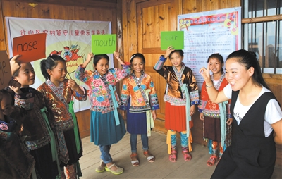 “小骆驼村寨英语站”是由融水苗族自治县几名山区小学老师发起,旨在帮助山区留守儿童学习英语的公益组织。志愿者利用课外活动和双休日,组织留守儿童做英语游戏、表演英语小话剧、做英语字母操等,丰富孩子们的课余生活,同时提高他们学习英语的兴趣。“小骆驼村寨英语站”自今年5月建立以来,已有12名老师成为志愿者,在4个山乡开设了7个站点,有400多名孩子参与。图为9月8日,在融水拱洞乡中心小学,“小骆驼村寨英语站”志愿者廖意慈(右一)领着孩子们做英语字母操。