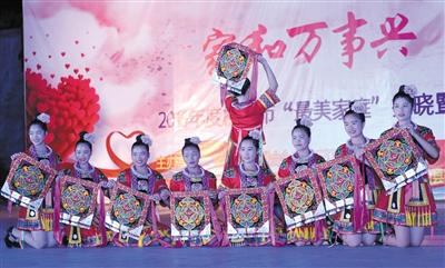 图为侗族姑娘在晚会上展示侗族刺绣。(通讯员 龚普康 摄)