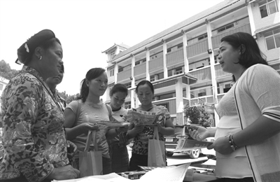 图为在该县红水乡,几名苗族妇女在了解企业用人情况。