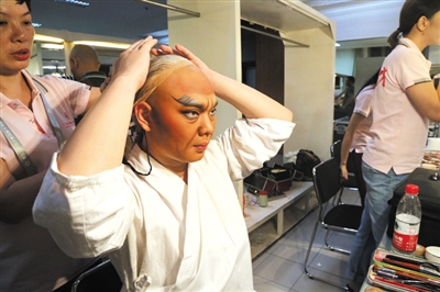 晚上7点30分,彩排还有半小时就要开始,总导演熊源伟不停指挥着字幕、音响等各组工作人员做最后的检查,同时交代主要演员把握好演出节奏,整台戏的演出时间要严格控制在2小时10分钟以内。他向剧组所有人员强调:今晚的彩排,一切都按照正式演出的标准!