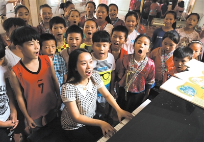 拱洞乡位于大苗山腹地,是广西最偏远落后的山乡之一。乡中心小学是寄宿学校,学生大部分是留守儿童。作为学校第一个全日制大学本科毕业的专职音乐教师,石祝瑛在学校深受学生的喜爱。她就职不久就发现,孩子们都像自己小时候那样喜欢歌舞。每天盼着上音乐课,下了课迟迟不肯离开教室。同时,放晚学后孩子们的课余活动也较为单调。当年11月,在学校的支持下,石祝瑛创办了学校有史以来的第一个合唱团,不久又创办了舞蹈队。这两支队伍的学员,多是8至12岁的孩子,作为非师范类大学毕业生,石祝瑛没有系统学过小学教育,更没有办合唱团和舞蹈队的经验。于是,她通过网络学习,并向山外老师请教,一点一点地解决困难。从此,放学后石祝瑛便轮流教孩子学唱歌、学跳舞,留守儿童的课外生活一下变得丰富而充实起来。