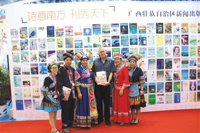 广西期刊展位的书架上摆满了刊物,集中展示了我区重点品牌期刊,其中,《三月三》杂志以其别具一格的民族特色,吸引了众多的参会读者来翻阅。中国期刊协会会长石峰饶有兴趣地拿起《三月三》壮文版,让编辑用壮语朗读了其中的一段文章,听后,石会长连连称赞壮文的读音悦耳动听,并对《三月三》杂志的出版工作给予了肯定。
