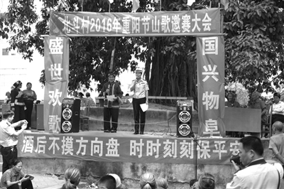 10月10日,宁明县城中镇北斗社区村举办2016年重阳节山歌邀请赛。来自县内外的120多名山歌好手纷纷登台竞技。该县公安局交警大队以这一活动为契机,通过壮族山歌演唱、现场咨询问答、发放宣传资料等形式,向广大群众大力宣传新交通安全法律法规,让大家增强交通安全意识。