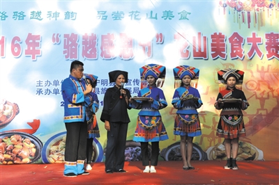 当天,现场人潮涌动,游客们一边品尝长桌宴上颇具当地特色的美食,一边观看台上紧张的厨艺比拼,其中还不时穿插精彩的文艺演出,让大家大饱眼福和口福。经过激烈的角逐,来自新城南菜馆、红玫瑰大酒店等餐饮企业以及当地民间厨艺高手参赛的花山芋头扣、绿叶情等15道色、香、味俱全的特色菜肴获得2016年度“花山名菜”荣誉称号。