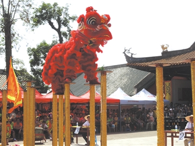 当天的龙狮比赛分传统南狮、高桩南狮、传统舞龙3部分,来自南宁市区及各县区的16支舞狮精英团队各展绝活,其中高桩南狮的表演着实令人称绝。在一根根木桩之上,舞狮者用高超的技艺展现狮子惊跃、审视、酣睡、发威、过山、上楼台等动作,一连串神形兼备、惊险刺激的表演引来游客频频惊呼喝彩。