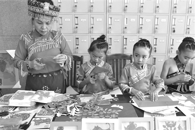 罗城是全国唯一的仫佬族自治县,仫佬族民间剪纸艺人罗华清多次走进校园义务授课,手把手地向当地青少年传授祖传的剪纸技艺,尽心尽力传播民族文化,深受孩子们欢迎。其剪纸作品《仫佬族非遗》《仫佬族神傩》分别荣获2015年、2016年广西工艺美术作品“八桂天工奖”金奖、银奖。图为在该县仫佬族博物馆,罗华清(左一)正在教孩子们学习仫佬族剪纸技艺。
