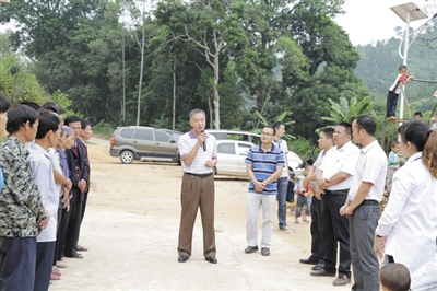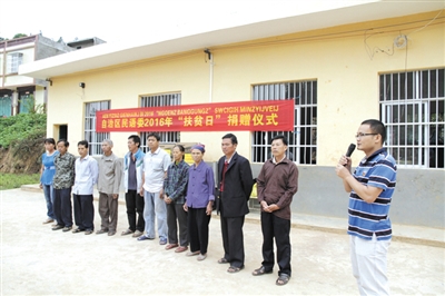 10月13日,受自治区民语委领导委派,该委机关党委(人事处)专职副书记韦拔志一行4人到该委定点帮扶贫困村——宁明县峙浪乡派台村、城中镇馗塘村开展“扶贫日”捐赠活动,将该委于10月12日上午组织该委机关和直属单位干部职工举行“捐出一份爱心,奉献一片真情”为主题的募捐活动中所收到的款项,分别送到该委定点帮扶贫困村派台村和馗塘村20户贫困群众手中,帮助他们解决一些实际困难。