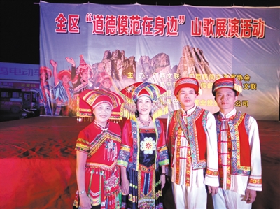 广西文联 、广西民间文艺家协会经过近半年时间收集素材,发动全区山歌爱好者撰写了400多首宣传道德模范的山歌,评选出了118首优秀作品进行展演。参加这次山歌展演活动的有广西民间文艺家协会专职副主席覃悦坤、副主席刘望明,中共平南县委常委、宣传部部长、副县长李乐,平南县文联主席覃一钊等。参加展演的歌手主要是来自南丹、天峨、宜州、东兰、都安、合山、阳朔、玉林、平南等地的27名山歌手。这些歌手除平南、玉林的以外,大多都是壮、瑶、苗、仫佬等少数民族歌手。龙江存是南丹苗族歌手,是广西山歌王中王,在这次活动中担任主持人。宜州歌手黄月霜、东兰歌手黄忠新、南丹歌手赵新田等曾经应邀赴海南、云南、贵州等地演出。广西女子监狱警察歌手韦淑英、都安歌手黄丽琼、乐业歌手谢碧章、合山歌手兰培文等都是我区的歌手新秀。