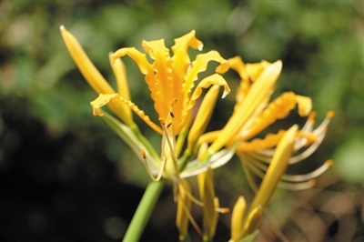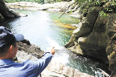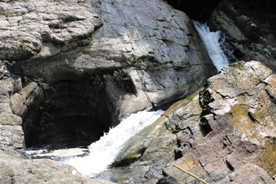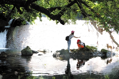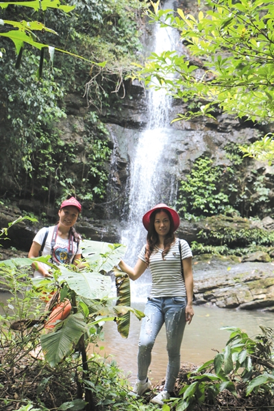 回到本文的峡谷探秘话题。拉瓮沟就是平山河发源地,总长有2000多米。沟里落差大,岩壁陡峭,古藤绕崖,山花盛开。瀑布潭是这条沟的核心景点之一,瀑布从一块横亘整条冲沟的巨石上流下来,蔚为壮观。瀑布随着季节不同、雨天和晴天不同,水势有小有大,水大时响声震耳,水小时柔情如诉。瀑布潭上有一棵古榕,树冠往潭面伸展,几乎覆盖了近百平方米的瀑布潭。水小的时候,瀑布潭里的礁石就露出水面,像鳄鱼的脊背,像怪兽的肩膀,人站到这些礁石上照相,与水潭、榕树、瀑布浑然形成了一幅画面,按完快门把照片调出来一看,都让人陶醉。拉瓮沟里石壁上垂下来的古藤条,也千奇百怪,有的长长地从山崖上不知什么地方垂下来,可以同时承受四五个人扯起藤条沿壁而上……