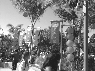 然而,令我感到吃惊的是,本是美国人的“总统日”,在这里却充满了中国人过春节的氛围。公园处处张灯结彩,大红灯笼高高挂起!“新年快乐”中文字样配上“Happy New Year”的英文标语,满眼都是中国红!广播喇叭里响着的,居然也是广东音乐《彩云追月》(虽然不是更加应景的《金蛇狂舞》或《步步高》)。更有意思的是,在公园入口处,每个游人都会收到工作人员派发的 “利是” 红包。这一切,真让我这个第一次在国外过年的人非常的惊讶,同时又感到无比的亲切。