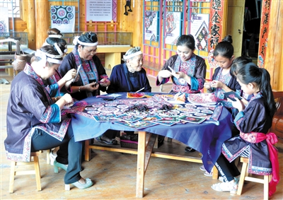 近年来,三江侗族自治县以“公司+基地+农户”模式发展壮大侗绣产业,使侗绣产品远销海内外。同时通过启动“非遗”学堂、“非遗”课堂、“非遗”培训班等办法加大人才培养力度,有效促进侗绣技艺的传承与发展,使侗绣成为村民脱贫致富的新增长点。图为10月23日,几名学生在该县同乐苗族乡同乐村侗绣博物馆内向当地艺人学习刺绣技艺。(通讯员 吴国聪)