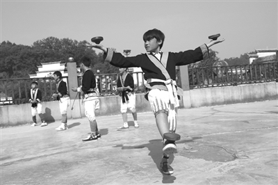 打陀螺是白裤瑶族最钟爱的一项由来已久的健身娱乐活动,这项活动已成为白裤瑶群众逢年过节必不可少的活动内容。据悉,白裤瑶陀螺已被列入自治区级非物质文化遗产保护名录。陀螺的玩法除传统的放和打外,还可在空中直接用手掌去接旋转的陀螺,并让陀螺在掌心中、脚背上、指尖上、额门上、下颌上旋转等,让人大饱眼福。图为白裤瑶小学生在秀陀螺。