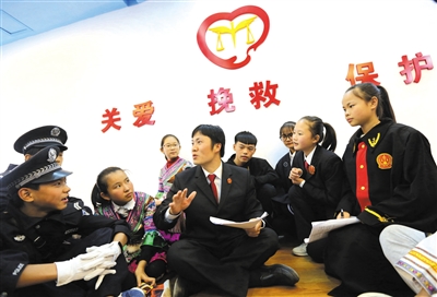 图为12月7日,在融水苗族自治县民族中学,该县法院少年法庭审判长余宏伟(中)在 “庭审”结束后进行评点。