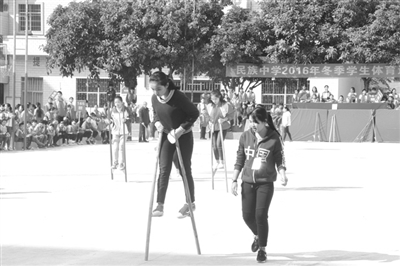 12月16日,环江毛南族自治县民族中学举办为期两天的2016冬季校园运动会。本次运动会将踩高跷、三人板鞋竞走、背篓抛绣球等民族传统竞技融入其中。全校师生都积极参与,乐在其中。图为同学们正在比赛踩高跷。