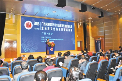 本报讯(记者 覃雅妮)为推动广西民族文化传承与创新,深化产教深度融合,12月16日,广西民族技艺行业职业教育产教融合对话论坛暨民族技艺成果展在广西科技馆举行。南宁职业技术学院校长张宁东,广西民族技艺行业职业教育指导委员会主任、自治区民委社会发展处处长黄日勇,自治区教育厅职成处副处长莫海燕,国家级工艺美术大师谭湘光,广西民间工艺大师梁紫童出席了会议并发表主题演讲。自治区教育厅民族教育处处长韦兰明出席会议并讲话。广西民族技艺行业职业教育指导委员会成员单位代表及有关师生代表共150余人参加了会议并参观展览,共同见证我区民族文化传承教育创新的最新成果。