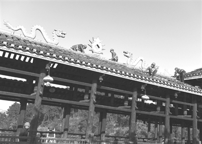 图为12月27日,工人在三江风雨桥上维修换瓦。