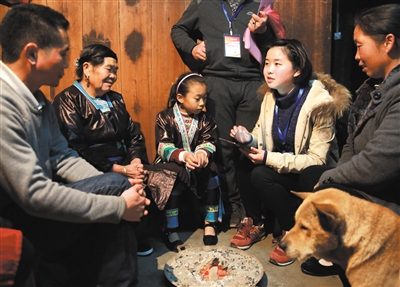 图为1月1日,在融水苗族自治县杆洞乡杆洞村,普查员张雯(右二)在农户吴耀银家里进行 农业普查入户调查登记。(通讯员 龙 涛 摄)