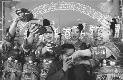 图为在该县金芦笙广场,热情的苗家阿妹向一名游人敬酒。