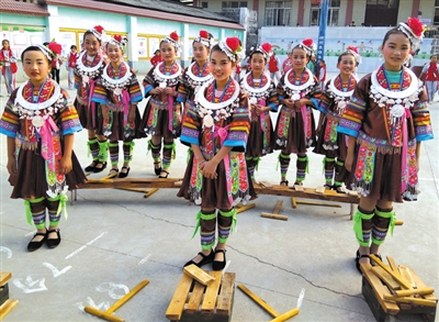 “捶呀捶呀,捶呀捶呀,捶苗布,年年中秋捶苗布,捶声处处响叮当,村村寨寨捶苗布,家家户户捶布忙,棉花自己种,纱线自己纺,蓝靛自己染……”原生态乐器演奏与绚丽多彩的苗装展示,漂亮的苗家达配们轻快欣喜地跳起踩堂舞,随着一声紧似一声的旋律和着稚嫩的童声欢跃,身上的银饰伴随着旋转的裙裾摇曳着,头戴的银饰和着变换的舞步敲击共鸣。这是2016年12月27日,融水苗族自治县融水镇中心小学“童声飞扬”合唱队在融水中小学生第二届校园文化艺术节展演比赛上表演的花式合唱《捶苗布》。