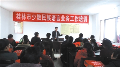 桂林市民族宗教事务委员会副主任潘天秀从壮文字母及声韵、日常基本用语和礼貌用语、民族语言技巧、壮族与其他民族关系等几个方面进行了详细讲解,讲解重点以基本发音和简单对话为主,对基础较好的壮族同胞则重点从提高口语能力和语言技巧,扩大词汇范围,准确把握语感,集中强化听、说两个方面的技能,进一步提升壮语掌握水平。