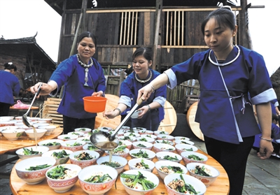 三江是非物质文化遗产资源丰富、集中、原生态保存完好的地区,被誉为“世界桥楼之乡”。198座风雨桥、228座鼓楼,分别保存在全县的167个村(社区)的510个村屯中。目前保存较好的古村寨有200个,其中高秀村、高友村等9个村屯被列入中国传统村落名录,12个村寨被命名为“中国少数民族特色村寨”。面对城镇化发展和村寨防火改造,三江村寨如何在保护中发展,并如何留住美丽乡愁?2015年10月,自治区人大常委会批准通过《三江侗族自治县少数民族特色村寨保护与发展条例》,民族文化遗产有了“保护神”。2008年至2014年,三江完成以水改、电改、灶改、寨改为主要内容的村寨防火改造工程,开辟了少数民族村寨“消防带”。冠小百家宴就是在寨改中发展侗族文化饮食产业,寨子被列为三江风情旅游接待点,年创收超过200多万元。