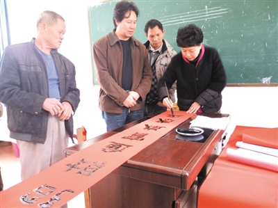 春联书写现场也是热闹非凡。广西书法家协会的几个书法名家正挥毫泼墨,为村民们免费写春联、写“福”字。一副副笔法娴熟的红春联和精美大方的“福”字,深得群众的喜爱。(通讯员 黄勇芳)