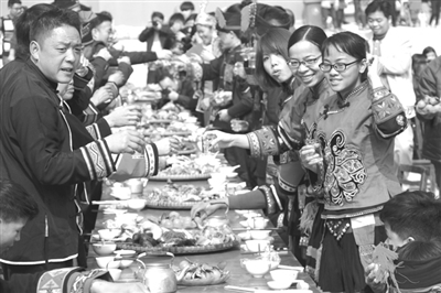 图为瑶族群众摆起长桌宴庆祝入住新居。(韩金秦 摄)