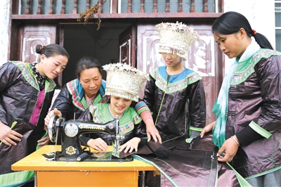 连日来,在环江毛南族自治县思恩镇陈双村双乐苗寨,苗族服装制作技艺传承人刘寿兰(左二)在指导苗族姑娘们制作苗族服装,期望年轻的苗族姑娘们担当起传承民族文化的重任。据悉,手工制作一套完整的苗族服饰,要经过纺织、染色、刺绣、成衣等工序,每道工序里再细分为3到8种不等的程序,而苗族服饰上的苗绣图案源于生活,极具乡土气息和较强的艺术感染力,是中华民族的文化瑰宝。