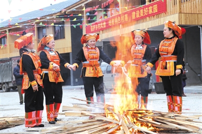 一大早,全村男女老少早早地就起来挂灯笼,贴对联,打扫卫生。鲜红的对联和灯笼映衬着一张张洋溢幸福的笑脸。早上,其他村的瑶族同胞也闻讯赶来庆贺,大家欢聚一堂其乐融融。新村街道上彩旗飘扬、锣鼓喧天、鞭炮齐鸣,欢快的锣鼓声响彻云霄,掩不住内心的喜悦的青年男女围着篝火跳起了瑶族传统舞蹈。