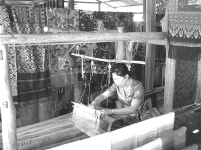 由于从小对织锦耳濡目染、口传身授,我也会织床单、“筒帕”等生活用品。虽然我在城市工作生活已近30年,但是常怀念过去睡的自制床垫、床单,盖的是自织的被褥,背的是自织的“筒帕”,忘不了那纺线车和织布机。每次去寨子采访,只要看到织布机我就会自然而然地重温一下织锦技艺。 过去,傣家女孩长到十一、二岁,便要学习织布绣花。傣族女子几乎人人都是善织布的技工、能刺绣的好手。我小时候也经常跟着母亲去采摘棉花然后纺棉线,看母亲用自制染料染上不同颜色,把棉线绕成线团,把线分为经线和纬线。父亲把木质织布机支上,把一个木框架好,分别牵引经线和纬线的箅子和梭子。织锦时,母亲先要设计出构思图样, 按照“纹版”的样式,安排不同颜色的经线和纬线,织出床单、被面、垫子等。刚开始学织锦,母亲先教我学会织白布,学会织白布后,母亲才教我织一些简单的花纹,编织花纹时,首先将花纹组织用一根细绳系在“纹板”上,用手提脚蹬的动作使经线成上下两层后,开始投纬线,如此反复循环织制,便可织成精美的傣锦了。