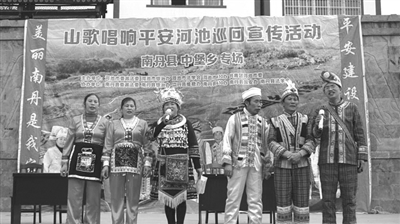 2月17日,由河池市政法委、市综治办、市法学会、市610办、团市委联合主办的“山歌唱响平安河池巡回宣传活动”在南丹县中堡苗族乡文化广场举行。