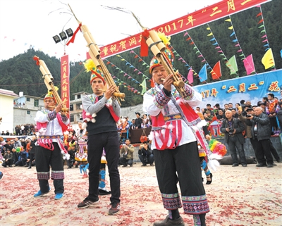 2月27日,农历二月初二,位于桂黔边界的广西融水苗族自治县洞头镇,来自桂黔各地的苗、侗等各族群众欢聚一堂,通过抢花炮、芦笙歌舞、舞狮、演“鸭变”等丰富多彩的民俗活动,欢庆一年一度的花炮节到来。