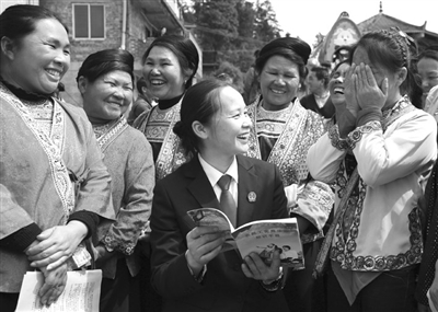 图为在该县安陲乡吉曼苗寨,法院工作人员在解答维权问题时,一名苗家妇女不好意思地捂脸而笑。