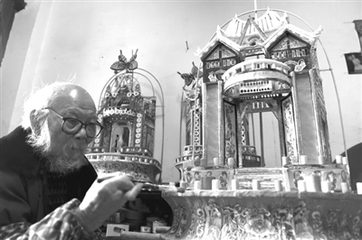3月21日,在三江侗族自治县富禄苗族乡富禄社区,侗族花炮节自治区级非遗传承人朱明先在家中赶制花炮台,喜迎“三月三”花炮节的到来。