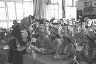 活动组先后到金秀镇金田中心小学、县民族小学、忠良乡中心小学、忠良乡敬老院等地讲述博物馆文物以及文物背后的故事。讲解员从“瑶山人家”“瑶绣多姿”“瑶都神韵”“瑶医瑶药”“石牌文化”“费孝通情系大瑶山”等板块逐步向大家生动介绍了瑶族博物馆整体概况,以及用互动、提问和抢答的形式让学生们快速掌握如何分辨5个瑶族支系的办法以及更深入地了解瑶族服饰的特点。图为3月23日,博物馆的老师用瑶族刺绣实物给学生们作现场讲解。