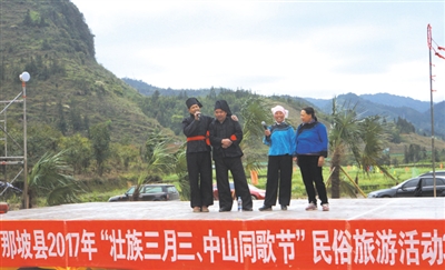 今年的同歌节,中山村根据自治区党委、政府关于打造“壮族三月三·八桂嘉年华”旅游文化消费品牌及自治区民宗委关于《2017年“壮族三月三 和谐在八桂”活动方案》的工作部署,结合当地的实际,融入了民族歌舞表演、地方特色美食等旅游项目,于3月25日(农历二月二十八日)举行庆祝活动,吸引了各地游客前往体会浓郁的风土民情。