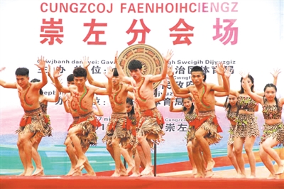 在广场一角进行的第八届山歌擂台赛上,来自区内各市县的壮、侗等少数民族优秀歌手一展歌喉,悠扬动听的歌声让游客们驻足聆听,陶醉其中。“壮族三月三·民族体育炫”崇左分会场表演项目活动,荟萃各市级壮族、水族、苗族、瑶族风情表演,令场外观众大加赞赏、连连叫好。民族服饰秀活动,穿戴各式炫丽少数民族服饰的姑娘小伙,成为了会场上一道靓丽的风景线。