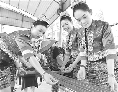 图为傣族姑娘在戛洒镇平寨社区为游客展示传统纺织技艺。